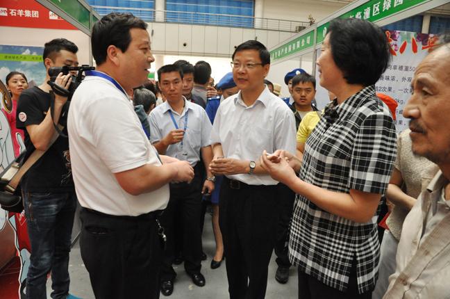 省政協(xié)副主席馮月菊(右一)、陜西省商務廳廳長姚超英(右二)等領導介紹石羊集團參展的產(chǎn)品.