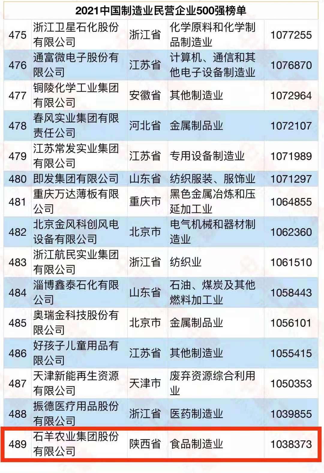 同日,全國工商聯(lián)在湖南長沙發(fā)布了2021中國民營企業(yè)500強(qiáng)、中國制造業(yè)民營企業(yè)500強(qiáng)、中國服務(wù)業(yè)民營企業(yè)100強(qiáng)三個榜單。其中,2021中國制造業(yè)民營企業(yè)500強(qiáng)入圍門檻100.51億元,石羊集團(tuán)榮列榜單第489位。